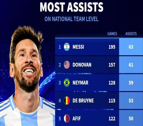 2025-10-16德国转会市场网站列出了历史国家队助攻榜,梅西以63次居首,多诺万以61次排名第二,内马尔以59次列第三。德转列国...