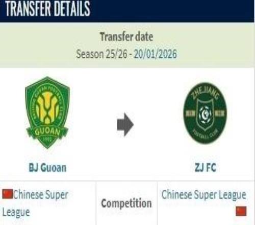 德转:方昊从北京国安加盟浙江队的转会费约500万人民币