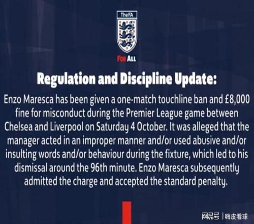 英足总已经发出公告,切尔西面对利物浦的比赛中,第96分钟,马雷斯卡由于存在不当行为,存在使用侮辱性的言语,主裁判因此出示红牌,被罚离场。有鉴于此,马雷斯特需要禁赛一场,同时还要缴纳8000英镑的罚款。马雷斯卡已接受了关于事实的指控,愿意接受相应的处罚。