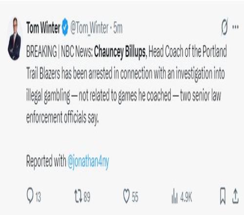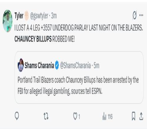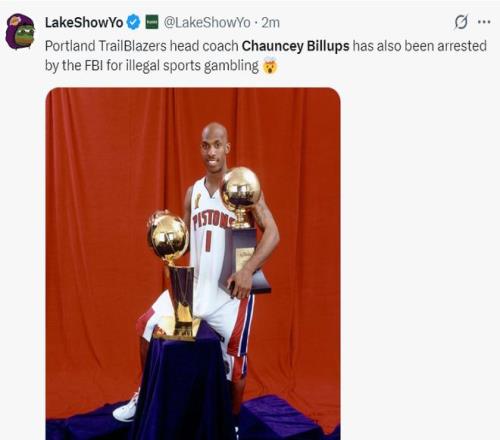 湖媒:波特兰开拓者队的主教练昌西-比卢普斯也因为非法赌球被逮捕,太令人震惊了!