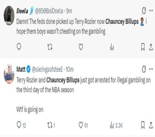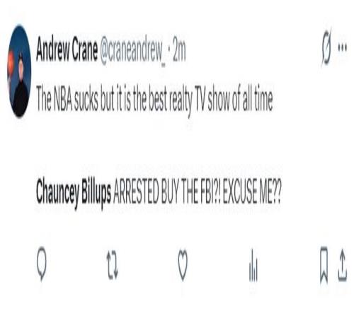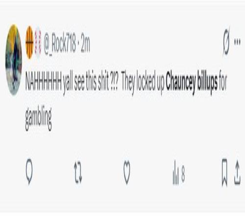 根据Tome Winter的跟踪报道,比卢普斯因为涉嫌非法赌球被捕,两位高级执法官员明确表示,昌西被捕不是参与他自己执教的比赛。(此事在全美范围内掀起轩然大波,因为几分钟之前Shams刚刚报道罗齐尔因为赌球被FBI带走)