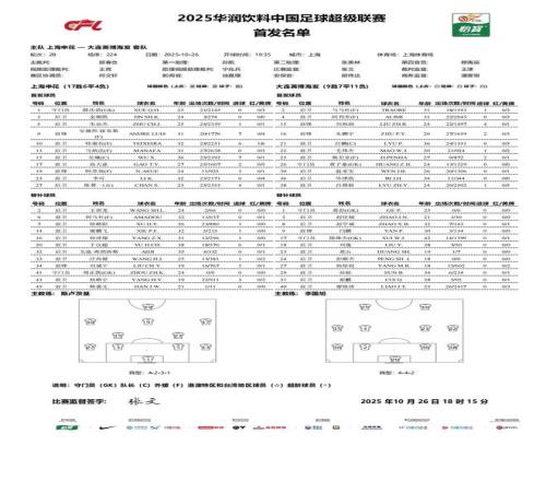 北京时间10月26日19:35,中超第28轮,上海申花主场对阵大连英博。赛前首发公布。