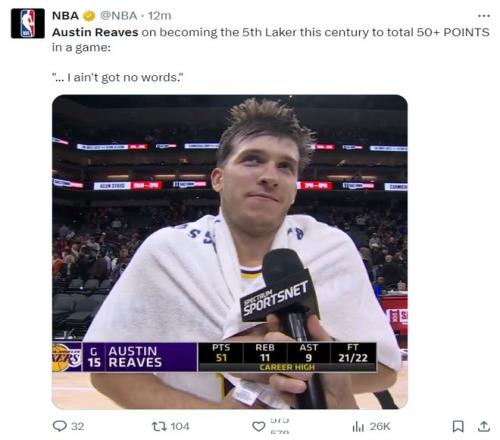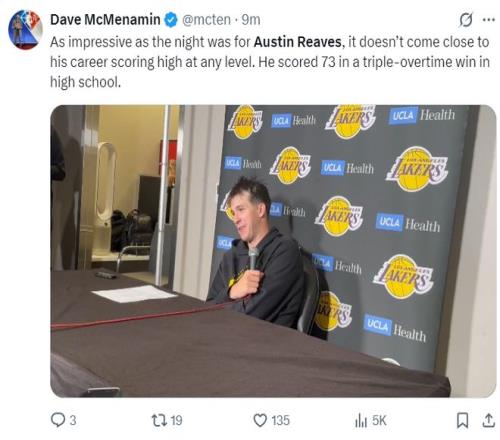 但赛后接受湖人媒体采访时里夫斯说道:嗯,这个夜晚的确非常精彩,但这跟我其他级别比赛创造的高分简直不值一提,我曾在高中的一场三加时的比赛中拿到过73分。(里夫斯这个回应时有些偷笑,有种笑侃不值一提的既视感)