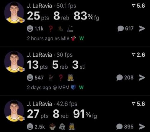 拉拉维亚在湖人三连胜期间,分别轰下27分8板2助1断、13分5板2助3断,以及25分8板3助4断,场均数据为21.7分7板2.3助2.7断,两项命中率78.1%和66.7%,真实命中率高达87.2%。
