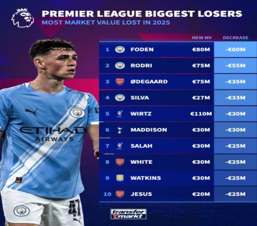 周四,《转会市场》公布英超球员2025年身价跌幅榜,一年身价暴跌6000万的福登排名榜首,罗德里、厄德高、维尔茨、萨拉赫也跻身前10位。