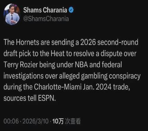 爆料王Shams:黄蜂送出一个26年次轮签补偿给热火,以此解决24年交易出现的纠纷。