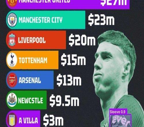 雷速体育10月8日宣 体育AI和大数据分析公司Sponsorlytix统计了2025年英超联赛中球衣衣袖广告收入排行的前...