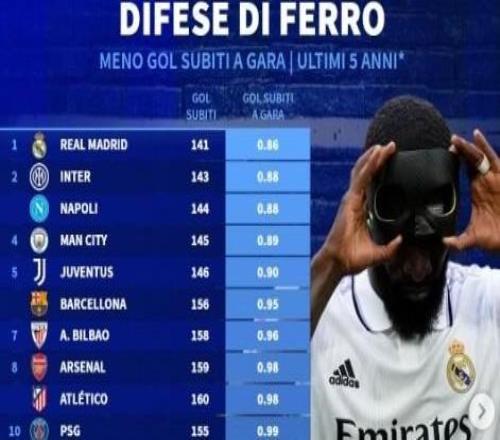 近5年五大联赛场均失球最少榜:皇马0.86球第1,国米0.88球第2