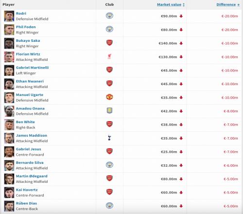 2025-10-18英超身价跌幅榜:罗德里、福登下跌2000万欧,维尔茨、萨卡下降1000万欧更多消息,稍后带来。...